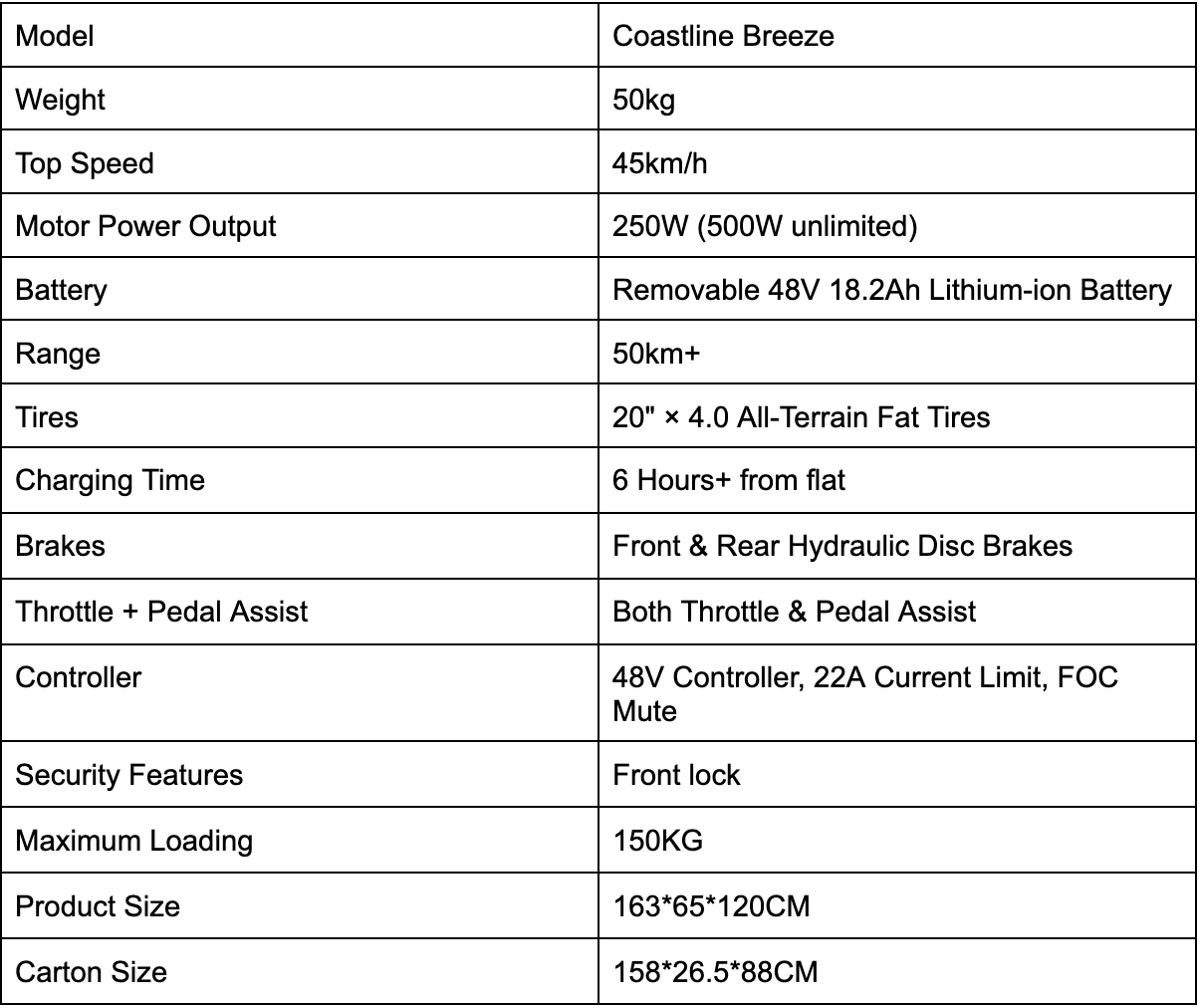 The Coastline Breeze is designed for riders who want effortless comfort, easy access, and relaxed control without sacrificing performance. Built around a practical step-through frame, it’s ideal for everyday riding, commuting, and casual cruising.